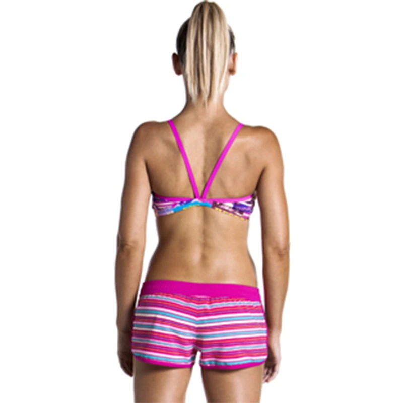 Loose fitting cropped pull-on beach short with shirred waist, side pockets and draw cord to fasten.