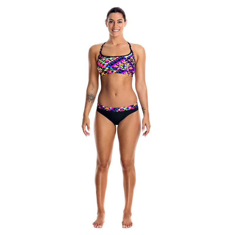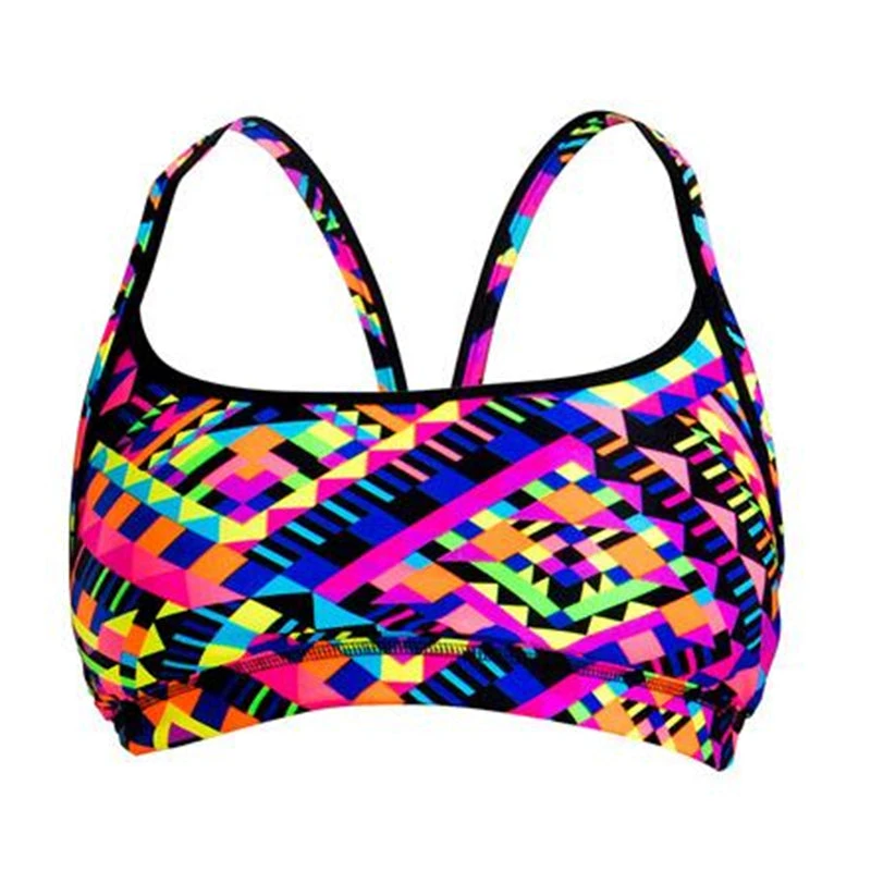 Firm fitting sports crop top with racer back and double strap bind finish with wide elastic for under bust support to give you the support you need in a sports top. Sold as separates and available in sizes 8 – 14.