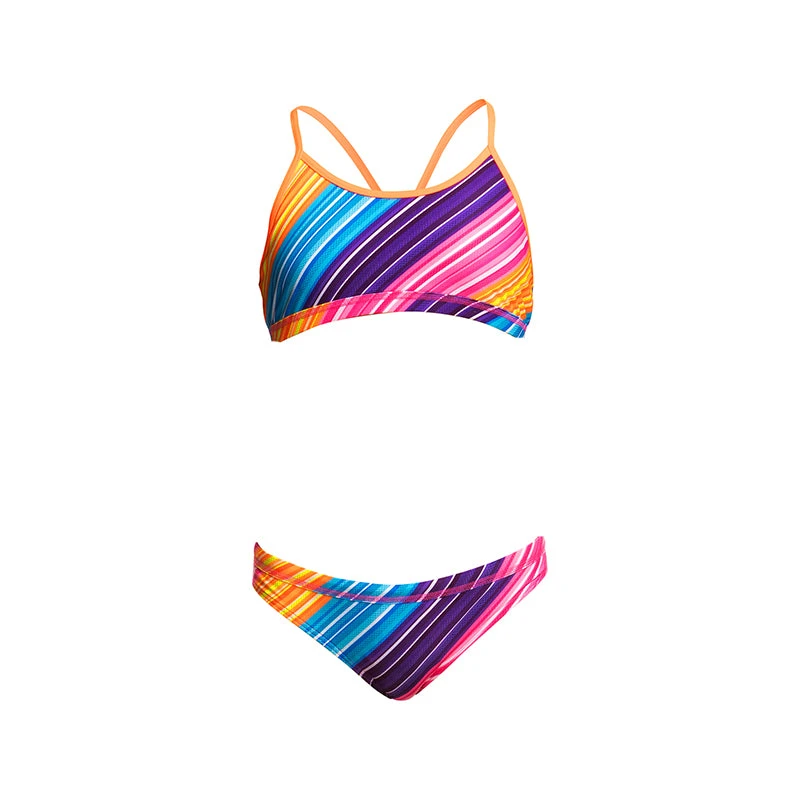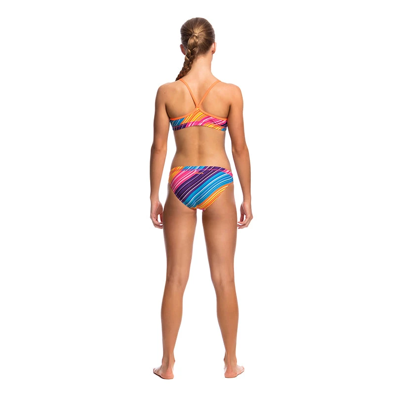 A firm fitting crop top and hipster brief suited to the sporty girl. Its a secure fit with underbust and waist elastic and drawcord in the brief. Features a single shoulder bind strap finish.