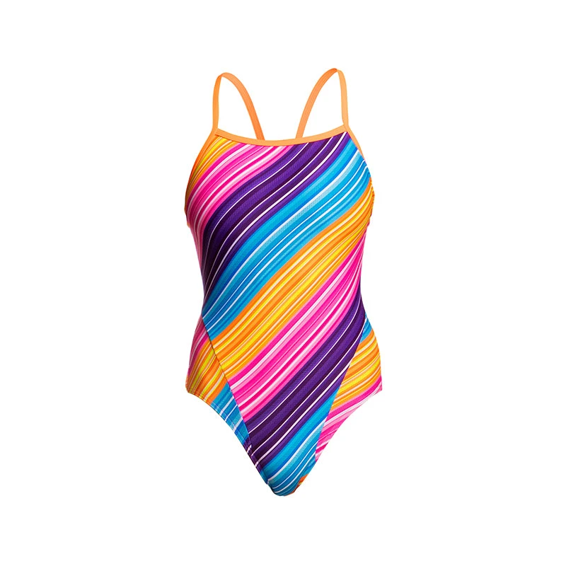 Single strap one piece with strappy V shaped back. Excellent durability and freedom of movement with single bind finish and an open back that will flatter your sporty shape. With full front lining, this is the perfect style for those long hours of training in the pool.