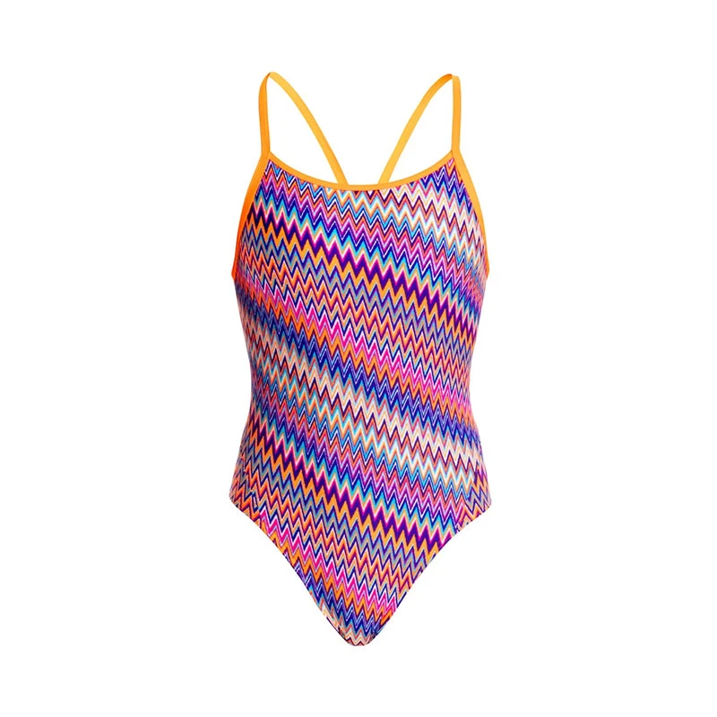 Our classic training style with signature diamond back strap finish and modest rear coverage is perfect for lap sessions. Features a circular cut-out back. With front lining and Funkita embroidery, this easy style says it all. Available in girls sizes 8 – 14.