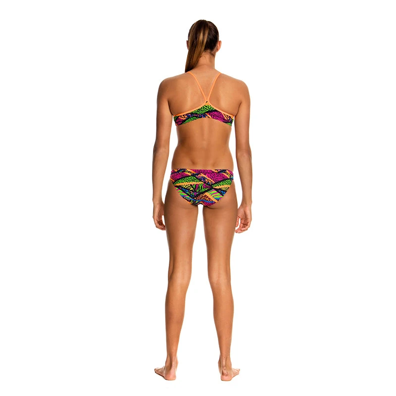 A firm fitting crop top and hipster brief suited to the sporty girl. It’s a secure fit with underbust and waist elastic and drawcord in the brief. Features a single shoulder bind strap finish. Available in sizes 8 – 14.Â