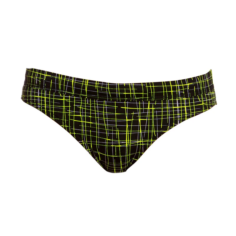 Hipster sports brief with drawcord and flat elastic waistband. Moderate leg rise and rear coverage. Sold as separates.