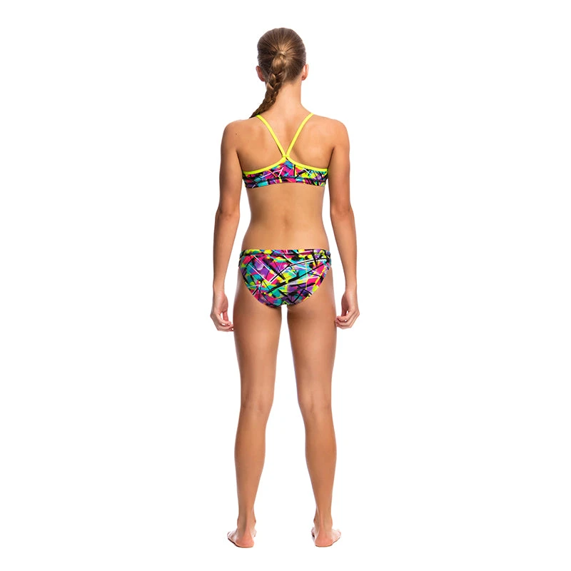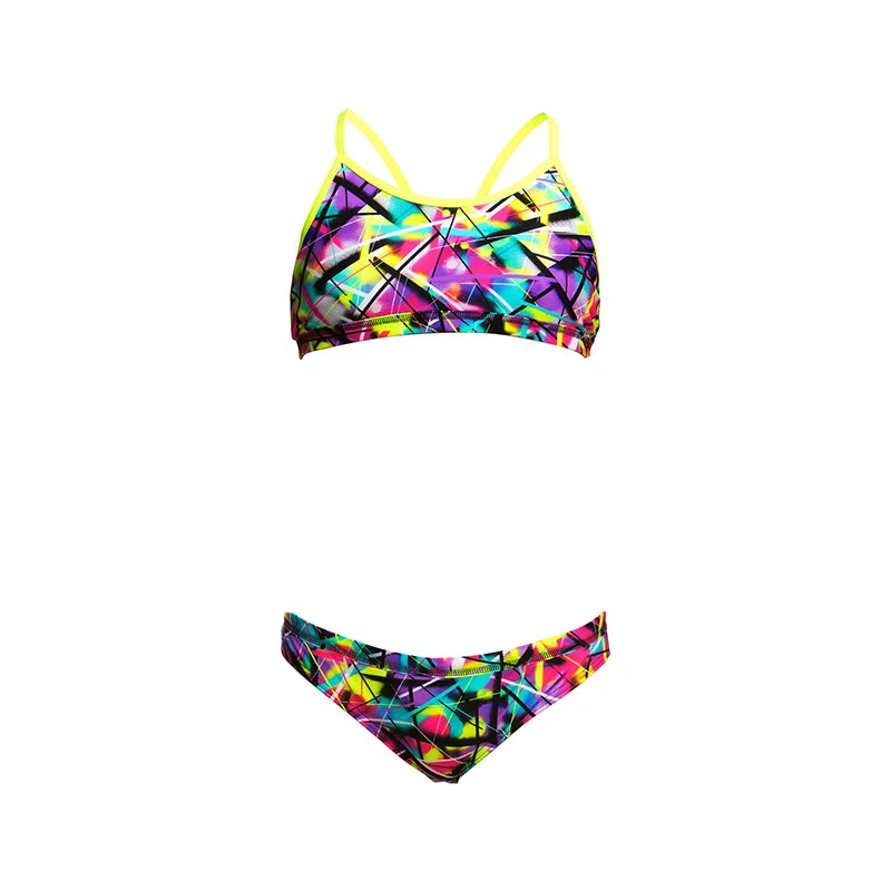 A firm fitting crop top and hipster brief suited to the sporty girl. It’s a secure fit with underbust and waist elastic and drawcord in the brief. Features a single shoulder bind strap finish.