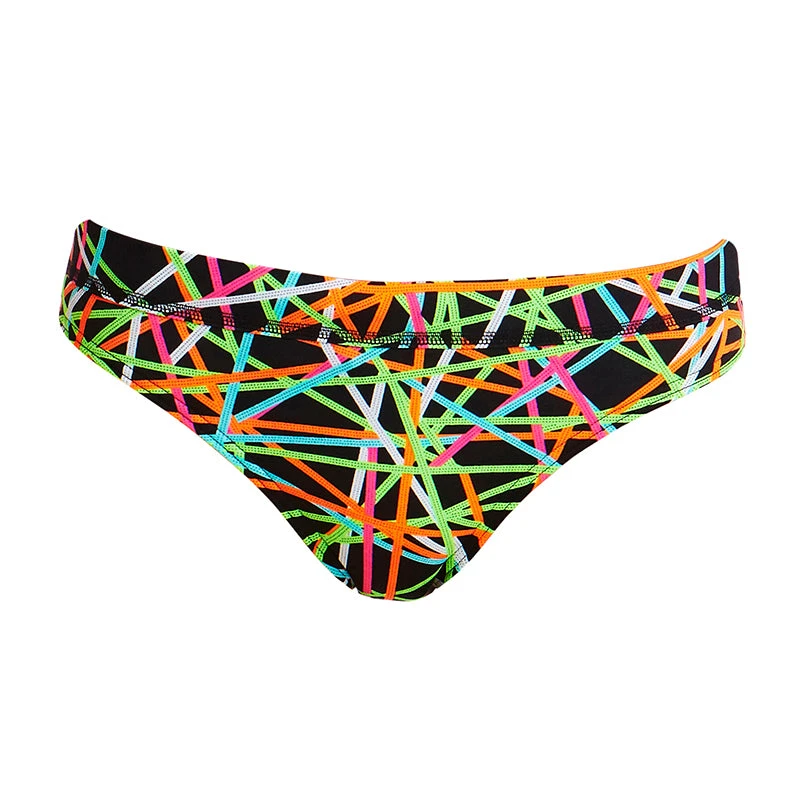 Hipster sports brief with drawcord and flat elastic waistband. Moderate leg rise and rear coverage. Sold as separates and available in sizes 8 – 14.