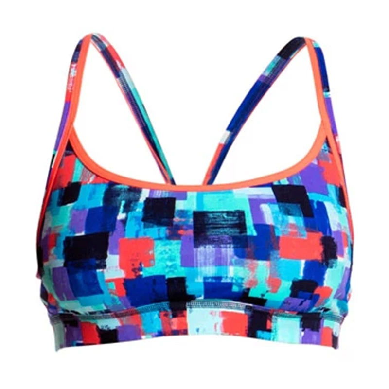 Firm fitting sports crop top with racer back and double strap bind finish with wide elastic for under bust support to give you the support you need in a sports top. Sold as separates and available in sizes 8 – 14.